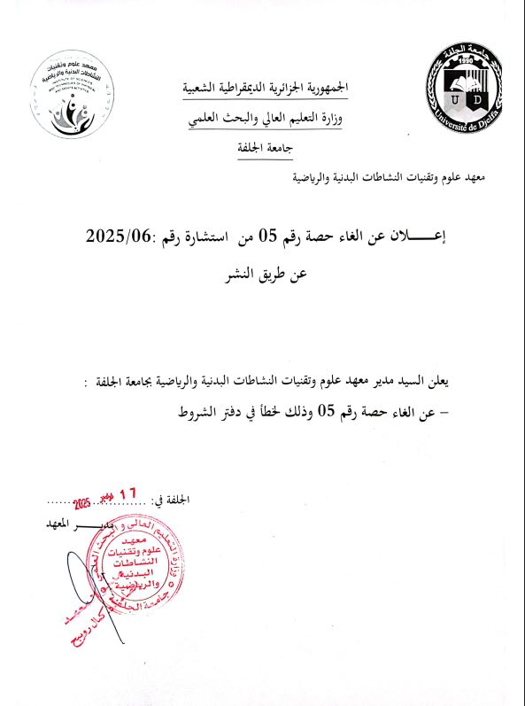 إعلانات هامةاستشارات اعلان عن الغاء حصة رقم 05 من استشارة رقم 2025/06 By staps - 17 نوفمبر، 2025 0 27 FacebookTwitterPinterestWhatsApp