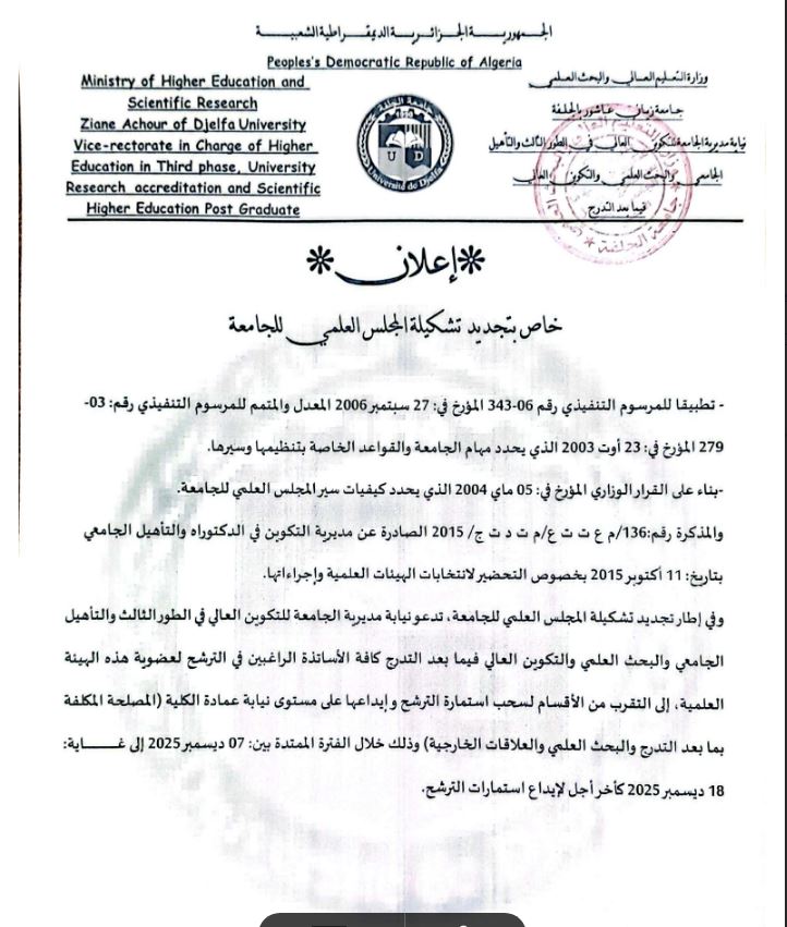 إعلانات هامةاستمارات خاصة بالأساتذةخاص بالاساتذة تجديد تشكيلة المجلس العلمي للجامعة By staps - 9 ديسمبر، 2025 0 10 FacebookTwitterPinterestWhatsApp استمارة-الترشح-لعضوية-المجلس.عتنزيل
