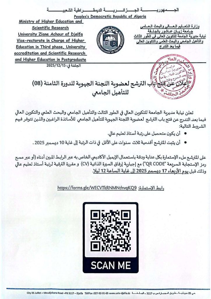 إعلانات هامةخاص بالاساتذة فتح باب الترشح لعضوية اللجنة الجهوية للدورة الثامنة للتأهيل الجامعي By staps - 15 ديسمبر، 2025 0 16 FacebookTwitterPinterestWhatsApp